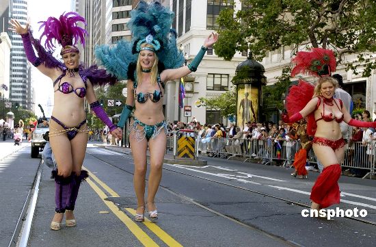 美国旧金山市六月二十七日举行第三十四届同性恋“自豪大游行”。图为盛装打扮的女子手拉手参加游行。陈钢 摄