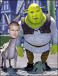 图1则把贝克汉姆设计为了《怪物史莱克》中那只喋喋不休的驴子,而本届欧锦赛上表现出色的小将鲁尼则成为了史莱克。