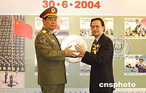 中新网6月30日电 香港邮政今日发行“中国人民解放军驻香港部队”特别邮票。发行仪式今早在香港邮政总局举行,香港邮政署长蒋任宏与中国人民解放军驻香港部队参谋长王玉仁少将一同在巨型首日封上盖印,象征邮票正式发行。
