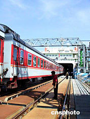 六月三十日,粤海铁路通道进行客运列车上下火车轮渡牵引测试,为开通跨海火车客运作准备。在测试中,载着近二百位乘客的客运列车通过栈桥直接驶入粤海铁二号火车轮渡火车甲板,人客未分离。作者:关向东