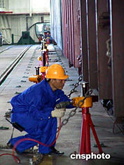 六月三十日,粤海铁路通道进行开通以来最大的牵引测试,火车车厢驶入火车轮渡甲板后,由专业技术人员将其绑扎固定,防止轮渡在海上运行期间,列车发生位移。作者:关向东