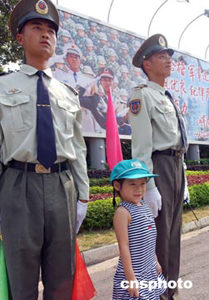 为庆祝香港回归祖国七周年,中国人民解放军驻香港部队于七月一日举行三军军营开放活动,在赤柱军营一名小女孩与解放军士兵一起合影。 作者:钱兴强
