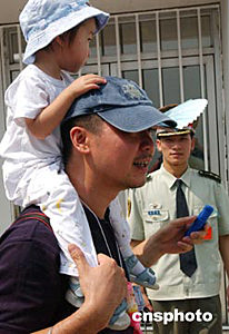 为庆祝香港回归祖国七周年,中国人民解放军驻香港部队于七月一日举行三军军营开放活动,图为一位男士背着孩子兴致勃勃来到赤柱军营参观。 作者:钱兴强