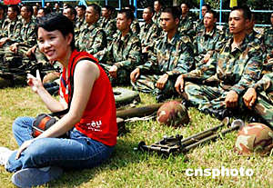 为庆祝香港回归祖国七周年,中国人民解放军驻香港部队于七月一日举行三军军营开放活动,在赤柱军营一名女青年兴高采烈与在烈日下等候演练的士兵拍照。 作者:钱兴强