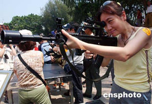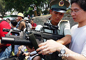 为庆祝香港回归祖国七周年,中国人民解放军驻香港部队于七月一日举行三军军营开放活动,在赤柱军营参观者对各种武器展示充满兴趣。作者:钱兴强