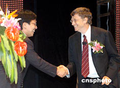 微软公司董事长兼首席软件架构师比尔·盖茨,7月1日出席在北京举行的2004微软新技术展望大会,并为2500余名大学生及2000位软件开发人员演讲,并共同探讨未来无缝计算的发展趋势。图为微软亚洲研究院院长沈向洋(左)与比尔·盖茨握手。中新社记者:张宇