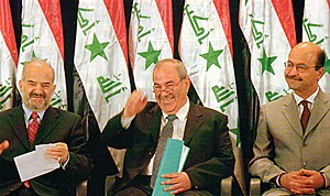 代表伊拉克新政府的权力的,主要是三个方面:总统、部长会议和国民议会。伊拉克的总统很大程度是一个象征性的职位。不过,部长会议发布的法令在成为法律之前,必须得到总统和两个副总统的一致同意。