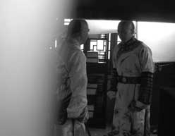 记者前天11时许来到怀柔飞腾影视基地时,天气十分炎热,在基地寻找了10多分钟,后在一个小院旁边发现了《纪晓岚3》剧组的道具车。顺藤摸瓜,记者把相机放在裤包里悄悄走了进去。一间封闭的小房间里传出了张国立和王刚对台词的声音。但是记者还未移到摄像机后,立即有工作人员逼问:“你是干什么的?出去出去!”记者说是影迷,只想看看张国立拍戏,工作人员仍然不放行:“不行!你快点出去,别影响我们拍戏!”