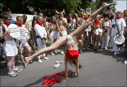 示威者们指出,为了吸引成千上万的游客,潘普洛纳每年都残忍地对待大批公牛,并在斗牛前对公牛进行针刺、鞭打等各种折磨以令其害怕,而这些虐待动物的行为都是应该被制止的。
