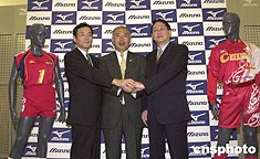 日本体育用品代表企业美津浓7月6日在东京展示赞助中国女排(图左)与中国女垒(图右)参加雅典奥运的比赛用服,并宣布将在北京奥运会之前的四年内加大投资中国的力度,争取占得更大市场份额。作者:王健