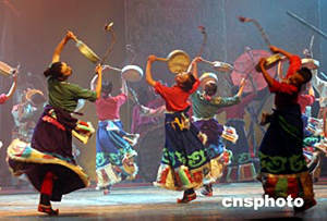 七月六日晚,云南迪庆藏族歌舞团在香格里拉表演原生态民俗舞蹈诗《香格里拉》,欢迎在此间参加情系香格里拉——两岸文化联谊行活动的两岸四地文化界人士。中新社记者:武仲林