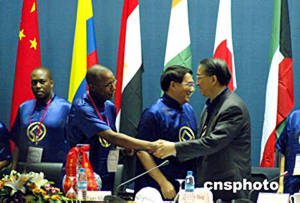 为期十天的第二十八届世界遗产委员会会议七月七日在苏州顺利闭幕。闭幕式上通过了下届世遗大会主席的选举议程,南非的丹巴·瓦卡什当选第29届世界遗产委员会会议的主席。图为章新胜与丹巴·瓦卡什握手(左)。作者:蒋振江