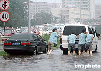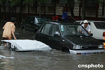中新网7月10日电(记者 闻育旻) 10日下午4时许,北京上空电闪雷鸣,突遭瓢泼大雨,北京城区部分街道水深及膝盖,部分车辆因发动机进水而瘫痪于路中,城区交通严重拥堵。