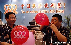 中国民营企业首次参加世界艾滋病大会,图为中国最大的民营安全套生产企业——安琪胶业的董事长和总经理在布置展位。第十五世界艾滋病大会七月十一日在泰国首都曼谷开幕。来自一百六十个国家的领导人、科学家、社会活动家以及艾滋病患者,共计一万五千多名代表出席了大会。中新社记者:曾利明