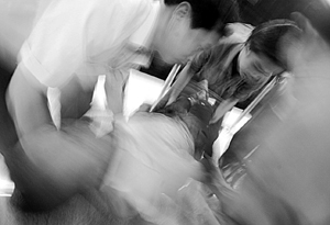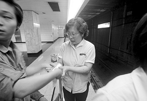 地铁工作人员盛丽敏(中)敲碎玻璃按紧急停车按钮,手受了伤。