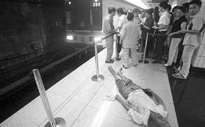 地铁工作人员把老汉抬上站台。