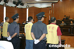 “一二·二三”特大井喷事故案今天上午九时三十分在重庆市第二中级人民法院开庭审理。图为审判庭内被告人在接受问讯。作者:邹辉
