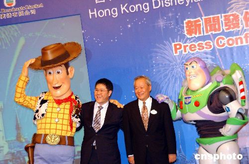 香港迪斯尼乐园及电视广播有限公司7月14日联合举行新闻发布会,宣布推出一系列迪斯尼动画及电影,图为迪斯尼电影卡通人物巴斯光年与胡迪出场助兴。作者:洪少葵
