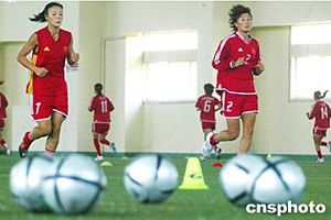 七月十四日,中国女足的姑娘们在上海东方绿洲训练基地积极备战,为即将到来的雅典奥运会做最后的冲刺。作者:汤彦俊