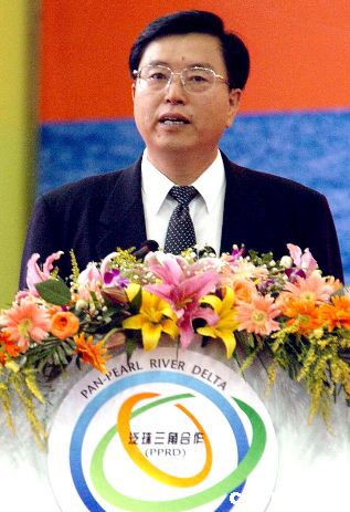 七月十四日,首届泛珠三角区域经贸合作洽谈会在广州国际会议展览中心隆重开幕,中国国家发展与改革委员会、商务部、国务院港澳办、国务院发展研究中心以及“9+2”政府组织的经贸代表团参会。图为中共中央政治局委员、广东省委书记张德江宣布“珠洽会”开幕。作者:陈文