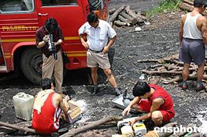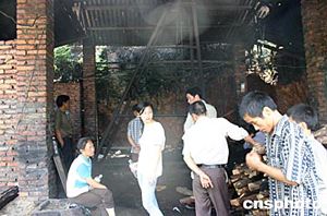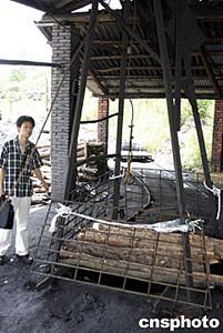 十四日七时,湖南湘潭双扶煤矿系统进行提升时,因电缆折断,造成电缆短路起火,导致井筒木支架起火燃烧,使当时正在井下作业的九十五人被困。现已确认有六人死亡,还有三人被困井下,下落不明。图为发生矿难的井口。作者:白祖偕