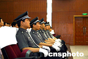 “一二·二三”特大井喷事故案今天继续在重庆市第二中级人民法院进行庭审,该庭审已进入第二天。图为法庭上的法警。作者:邹辉