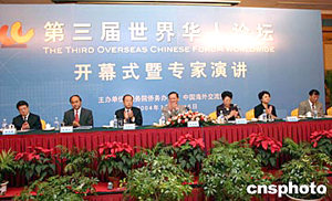 由国务院侨办和中国海外交流协会主办的《第三届世界华人论坛》七月十五日在北京召开。论坛以“建立中国----东盟自由贸易区:华商面临的挑战、机遇和对策”为主题,邀请近百名海内外企业家、政府官员、专家、学者相聚一堂,共谋发展。中新社记者:史利