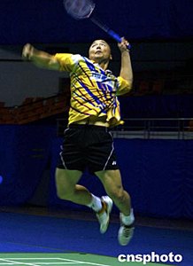 上届奥运会混双冠军张军,十五日在湖南益阳训练基地紧张训练,备战雅典奥运会。中新社记者:宋吉河