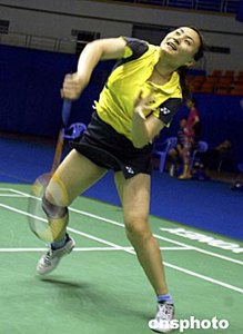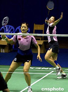 中国羽毛球队女双队员黄穗(前)、上届奥运会混双冠军高崚,十五日在湖南益阳训练基地紧张训练,备战雅典奥运会。中新社记者:宋吉河  赵婷婷紧张备战雅典奥运。中新社记者:宋吉河