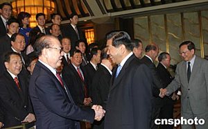 七月十六日,全国政协主席贾庆林、国务委员唐家璇在北京钓鱼台亲切会见了出席第三届世界华人论坛的全体代表。中新社记者:史利