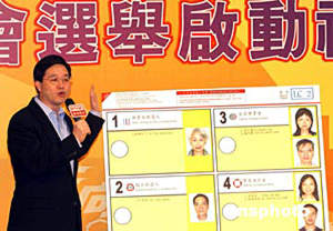 政务司司长曾荫权(右二) 、政制事务局局长林瑞麟(右一) 、民政事务局局长何志平(左二) 、选举管理委员会主席胡国兴大法官(中) 主持立法会选举开幕典礼并为选票加盖印。