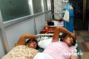 七月十九日,几名伤者在开封市第一人民医院输氧。位于河南开封的中国石油集团下属某公司一化工厂冷凝器发生爆炸,大量氯化氢气体泄漏。该厂南侧的岗桥村三百七十六名村民出现呼吸道和眼部刺激反应,较重的出现呕吐和头痛症状不良反应,开封市第一人民医院和开封县各医院已转移了上百名村民。截至十九日,大部分村民已返家。此次泄漏事故未造成人员死亡。事故中四名责任人已被警方控制。中新社记者:慎重