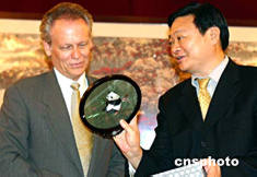 湖南省常务副省长于幼军七月十九日会见了美国爱普斯顿公司国际公司董事长麦克·大漠先生一行。麦克表示,爱普斯顿公司已决定在长沙设立中国中部第一家办事处,并有意介入湖南的项目开发。图为于幼军将一幅传统手工艺品湘绣赠与麦克先生。作者:白祖偕