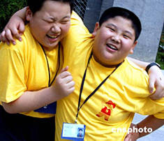 二○○四年七月二十一日,北京举办“世纪阳光‘小胖子’均衡营养运动夏令营”活动,参加活动前孩子们合影留念。据悉,北京一些‘小胖子’的家长在暑假期间支付高额费用把孩子送进夏令营,旨在帮助他们减肥。中新社记者:宋吉河