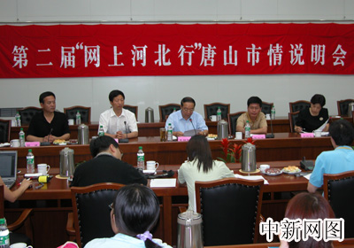 第二届“网上河北行”采风团的记者们21日来到唐山市采访,唐山市政府领导召开市情说明会向记者介绍了唐山现状。图为说明会现场。(秦欣摄)