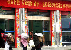 据最新统计数据显示:截至二○○四年七月二十日,中国内地证券投资基金的净值已经达到三千零一点九二亿元,约占A股流通市值的四分之一。而在二○○三年九月,基金净值占两市A股流通总市值的比例只有百分之十三点五。图为七月,云南香格里拉的几位居民经过一家悬挂着基金销售横幅的银行。中新社记者:武仲林
