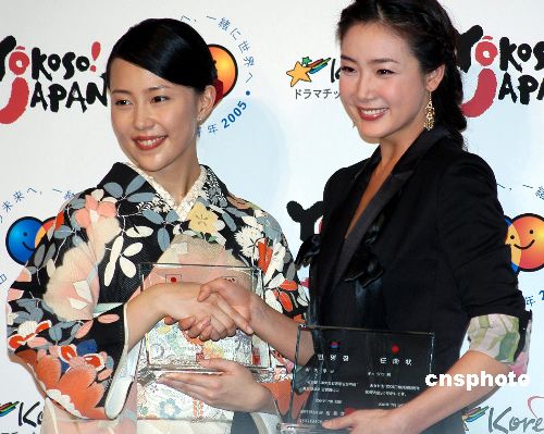 7月22日,韩国女星崔智友(右)与日本女星木村佳乃携手亮相媒体见面会,她们将担任亲善大使共同主持日韩邦交正常化40周年的一系列纪念活动。 作者:Ic/cnsphoto