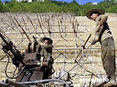 二○○四年七月仲夏,中国长江三峡地区降雨量增多,部分地区出现泥石流和山体滑坡。为防止移民新城和三峡库岸出现类似隐患,奉节县正抓紧时间治理沿江高边坡工程。图为进入伏季以来,雨后初晴之时,三峡地区奉节县新县城人民广场高边坡治理工地上,民工在暑热中浇混泥浆。作者:周会