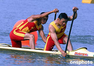 中国国家皮划艇队男子划艇运动员孟关良(前)、杨文军(后)七月二十六日在山东日照水库训练基地进行奥运赛前模拟实战训练,备战雅典奥运会。中新社记者:张勤