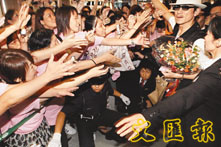 中新网7月27日电 据香港文汇报报道,刘德华昨早飞往日本为《十面埋伏》展开宣传,虽然他乘坐的班机要到下午四时半才抵达日本机场,但其三百名歌影迷却早在下午一时已到机场等候偶像。而机场方面的保安,见到如此多Fans也被吓著,当知道是华仔即将到达时,立即加派十五名保安,并架起围栏限制歌迷等候的位置,以免造成混乱。