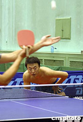 七月三十日,中国国家乒乓球队主力队员马琳正在河北正定乒乓球训练基地赤膊上阵,刻苦训练。中新社记者:张勤