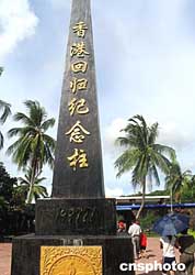 二○○四年七月下旬,在海南兴隆华侨农场的亚洲热带风情园里,竖立着两尊黑色金字的柱子。据悉,它们是香港与澳门回归纪念柱,这两尊柱子是该风情园的一大景观。作者:顾时宏