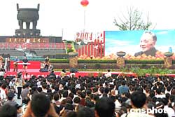 二○○四年八月三日下午,纪念邓小平诞辰一百周年大型歌会在小平故乡四川广安举行,宋祖英、张明敏、藏天朔、扮演邓小平的演员卢奇等参加文艺表演。图为大型歌会现场。作者:郭晋嘉