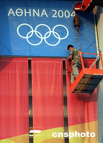 当地时间8月3日晚,一名建筑工人在雅典奥运会主体育场安装加固旗帜,开幕式将于8月13日在这里举行。中新社记者:任晨鸣