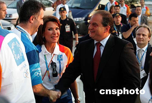 当地时间8月3日晚,希腊总理在组委会要员陪同下视察雅典奥运会赛场,并慰问志愿服务者。中新社记者:任晨鸣