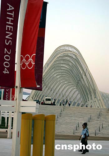 当地时间8月3日晚,雅典奥运会体育中心在夕阳映照显得别具一格。中新社记者:任晨鸣