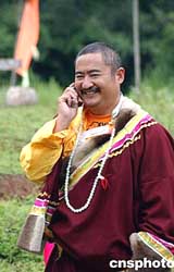 云南丽江古城文笔山文峰寺的喇嘛,使用新款手机与外界联系,文峰寺是文物重点保护单位,在当地民众中有崇高的地位。作者:洪少葵