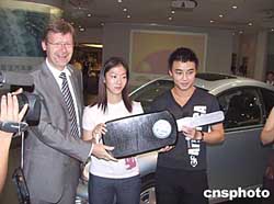 8月4日在北京王府井一次车展上,大众汽车分别向此次雅典奥运会的中国乒乓球队主力队员王皓、牛剑锋奖励一辆“甲克虫”型大众汽车,预祝中国乒乓球队在奥运会上再获佳绩。作者:任振兴