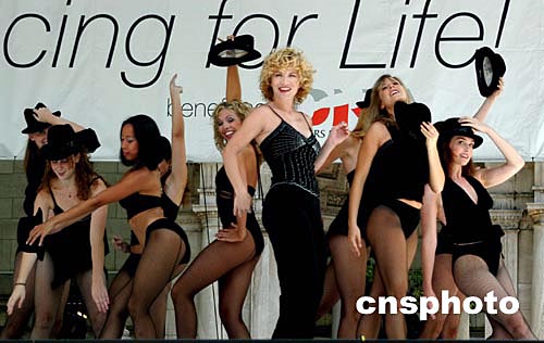 美东时间八月五日中午,纽约市中心布莱恩特公园内举办《为生命起舞》的义演活动,数十位百老汇艺员载歌载舞,为艾滋病患者募捐,支持他们在社会生活中继续获得平等权利。图为费丽莎·芬利(Felicia Finley)(中)引领舞者,表演《用强劲的音符打动我》。作者:陈建