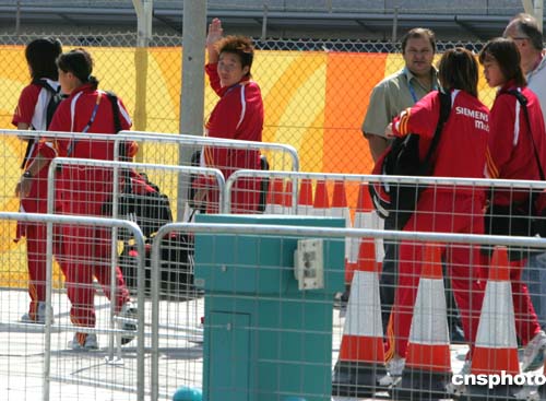 当地时间8月6日下午,参加雅典奥运会的中国女足抵达雅典,队员毕妍在严密的保卫下向远在隔离线外的记者招手。中新社记者:任晨鸣
